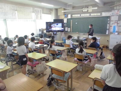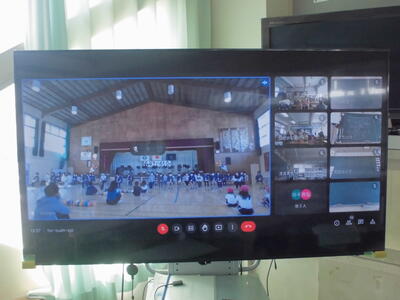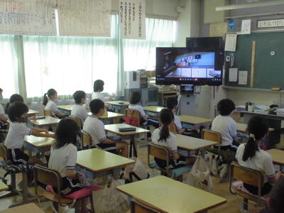 感染症対策のため、全学年が体育館に集まれません。そこで発表する学年以外は、教室のモニターと会場をリモートでつないで、教室で他の学年の発表を視聴します。