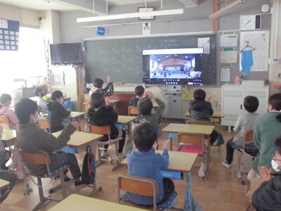 ( ↓ 教室では、体育館の様子を拍手しながら見守っています。)