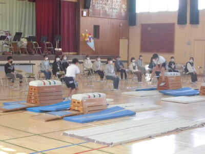 ( 続いて運動の発表です。マットや跳び箱の技を披露します。)