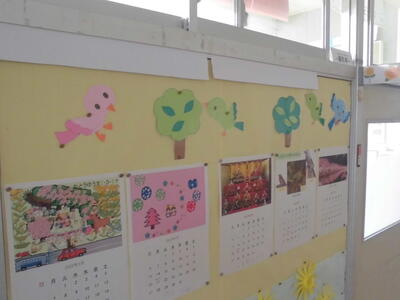 ( ↓ 子供たちがパソコンで作成した3月の手作りカレンダーが貼られています。)
