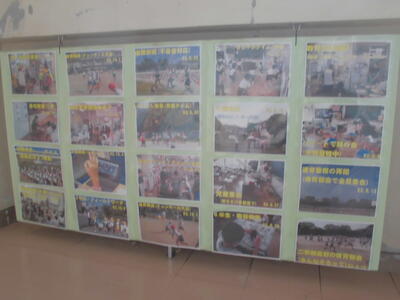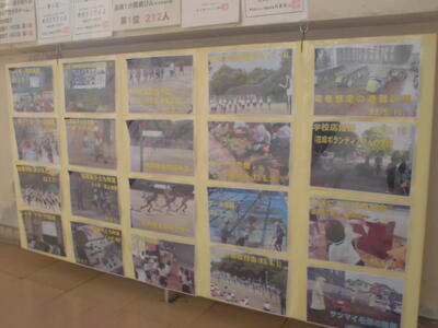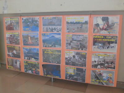 職員室前の廊下には。一年間の学校でのできごとが掲示されています。