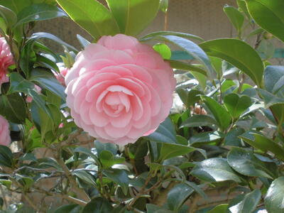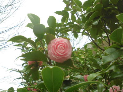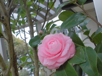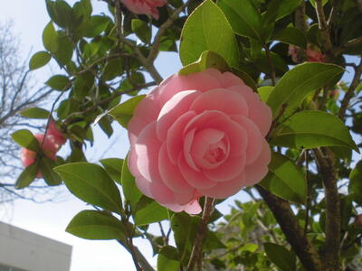 ( ↓ 学校に咲いているオトメツバキ。体育館横の木に、ピンクの花がきれいに咲いています。)