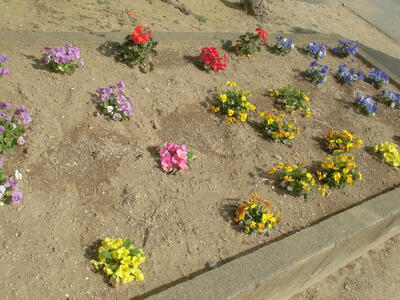 今日は日曜日で学校はお休みです。学校の花壇の花もきれいに咲いています。