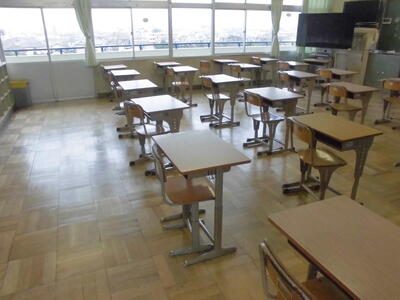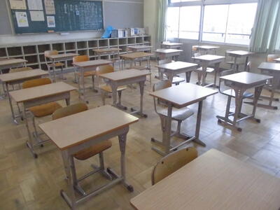 ( ↓ 卒業した6年生の今日の教室。持ち主がいなくなった机が少しさびしそうに見えます。)