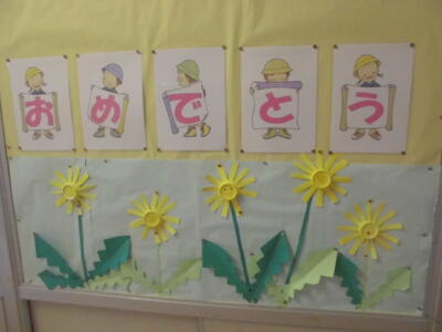 ( ↓ 卒業を祝う廊下の掲示。在校生が心を込めて作りました。)