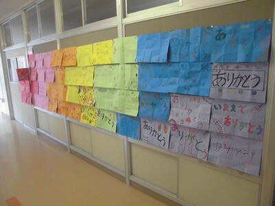 ( ↓ 6年生を送る会で、5年生が発表に使った色画用紙。7色の虹をあらわしたメッセージカードとなっています。)