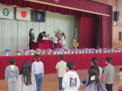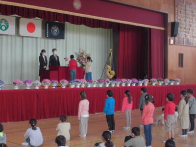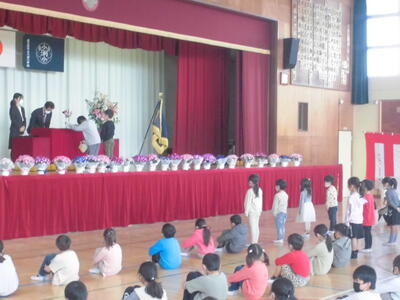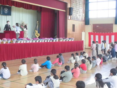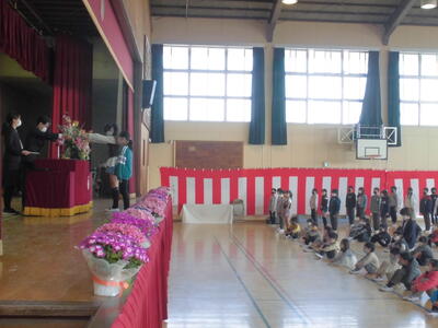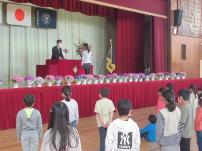 式の後に、本をたくさん読んだ「本いっぱい」、校庭をたくさん走った「汗いっぱい」の表彰がありました。