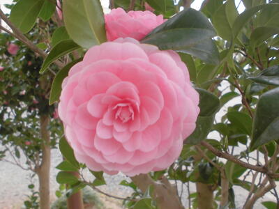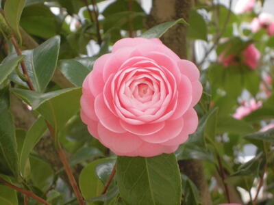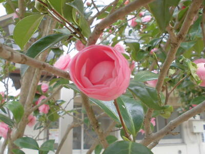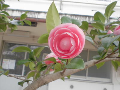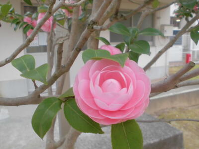 ( ↓ 学校に咲いているオトメツバキ。体育館横の木に、ピンクの花がきれいに咲いています。)