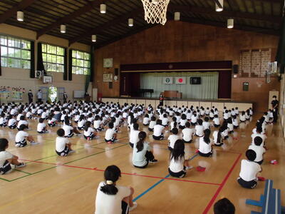 3連休が明け、5月最初の登校となりました。今日の朝は、お話し朝会です。お話し朝会は、放送での朝会が続いていましたが、今日は久しぶりに体育館に集まっておこないました。(感染症対策には気をつけて、児童同士の間隔をあけ、換気をじゅうぶんにおこないながら実施しました。)