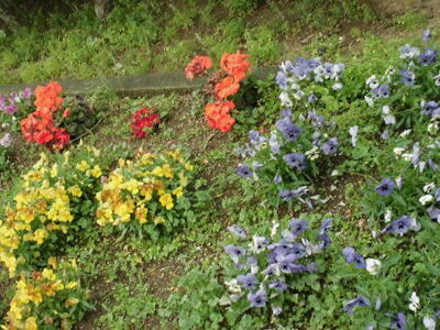 ( ↓ 写真は、校庭に面した花壇の花です。色とりどりの花が見られます。)