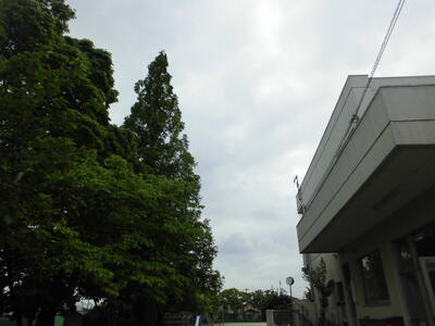 ( ↓ 今日の学校。雨はあがりましたが、くもり空が広がっています。)