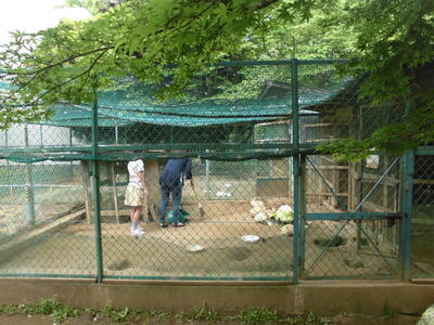 ( ↓ 飼育ボランティアさんが来校して、ウサギの世話をおこなってくれています。お休みの日にありがとうございます。)