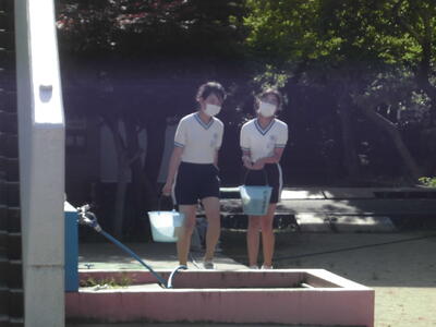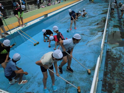 本日はプールの清掃の日でした。午前中に6年生が、午後に5年生が、水を抜いたプールの底やプールサイドなどをきれいにしてくれました。
