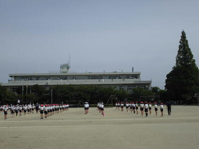 ( ↓ インターバル走と整理運動が終わって整列しました。)