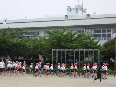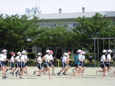 本日の朝は、さわやかタイム。全校で運動する時間です。子供たちは校庭に出て、元気に校庭を走りました。