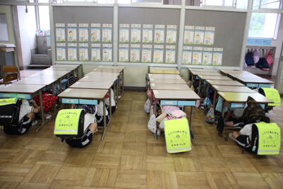 今日は、休み時間を利用して、竜巻を想定した避難訓練をおこないました。「竜巻接近」の放送を聞いて、各教室で机でバリケードを作り、頭や体を守る体勢を作りました。