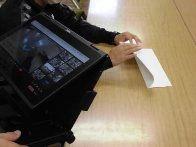 (体育担当の先生が、放送で、紙を使って「紙でっぽう」の作り方を、映像を流しながら実況して説明しました。)