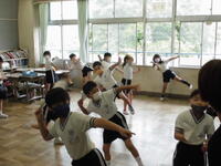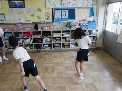 今朝のさわやかタイムは、放送でおこないました。教室のモニターを見ながら、手本の先生の動きに合わせてダンスをしました。