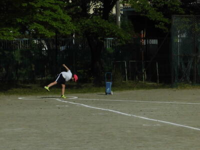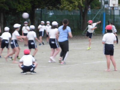 ( ↓ 午後の4年生の体育。ボール投げの練習をおこなっています。)
