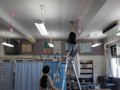 毎週、木曜日は図書ボランティアさんの活動日です。今日も図書室飾り付けなどをおこなってくださいました。