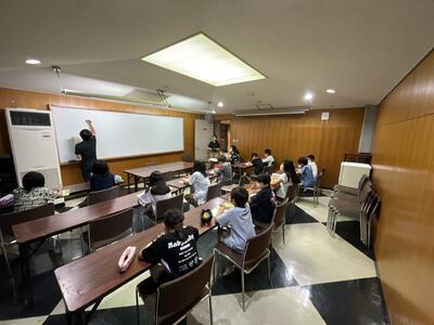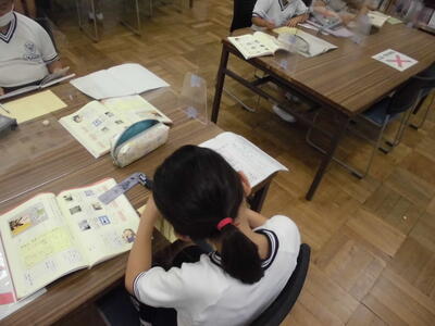 ( 教育委員会の方を講師に招いて、先生たちで研修をおこなっています。)