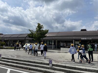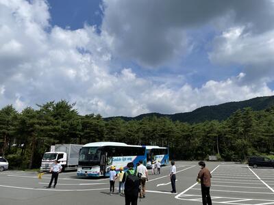 8:15 宿舎を出発して、富士山レーダードーム館の見学に向かいます。体調不良で宿舎に残る人もなく、全員が出発できました。雨も小降りになってきました。