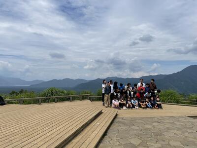 10:58 昼食場所の三湖台に着きました。富士五湖のうち3つが見える見晴らしの良いところです。クラス写真を撮ってからお弁当になります。ここまで体調悪い人もなくきています。