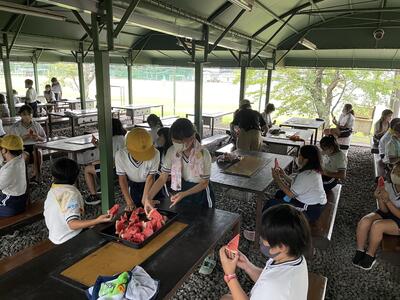 16:10 全員が参加してスイカ割りが終りました。棒が当たった人、当たらなかった人、惜しかった人がいました。皆で、スイカを美味しくいただいています。