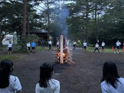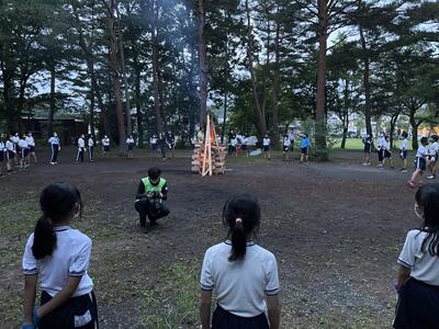18:40 キャンプファイヤーが始まりました。天気が心配なので、少し時間を早めて行っています。部屋に残る人もいなく、みな参加です。