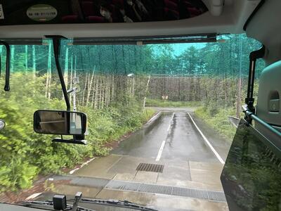 7:25 バスは幸手IC(インターチェンジ)から、高速道路に入りました。車内では感染症対策のため、会話やレクリエーションは無しにして、DVDを見ながら静かに過ごしています。
