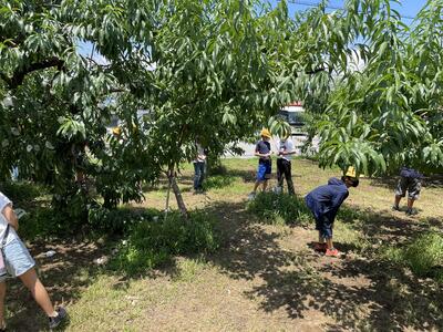 12:00 桃狩りを始めます。1人2つ、自分の手で桃を枝からもいで、お土産に持ち帰ります。