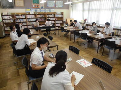 夏休み中も、先生たちは学校で勤務したり、出張へ出向いたりしています。今日は、学校で先生たちの研修です。