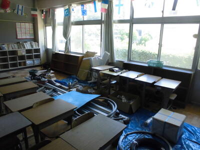 学校では、トイレの全面改修工事をおこなっていますが、並行して、特別教室へのエアコン設置工事も進んでいます。