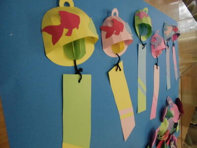 ( ↓ 上段には、金魚の模様の風鈴が飾られています。)