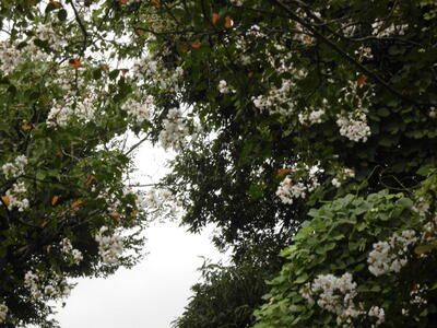 ( ↓ 学校では、サルスベリの木に花が咲いています。)
