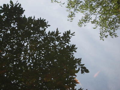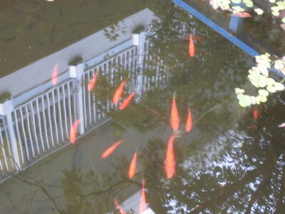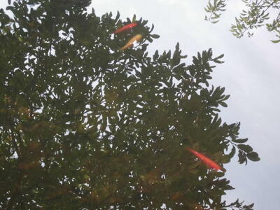 ( 水面に空や木が映っているので、魚が空に浮かんでいるように見えます。)