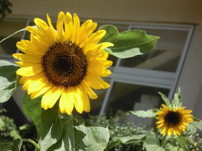 ( ↓ 教室の黒板に描かれている元気そうなヒマワリ。)