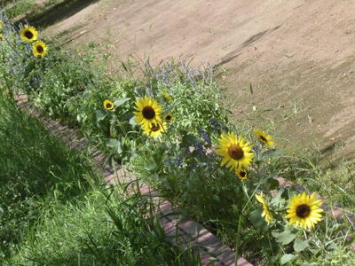 暑い中ですが、学校の中庭に色とりどりの花が咲いています。