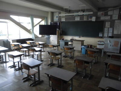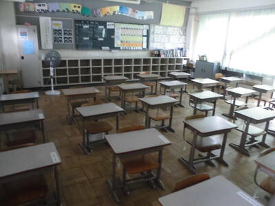 ( ↓ 子供たちの登校を待つ夏休み中の教室。)