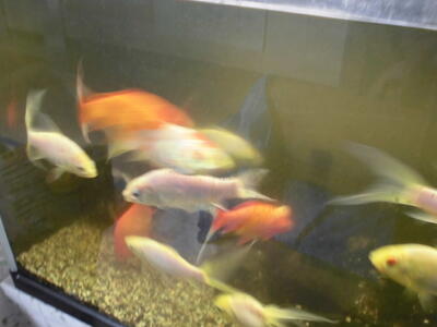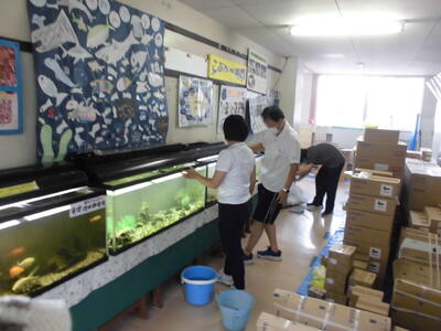 先日、校舎一階の渡り廊下の「小渕水族館」の水槽もきれいにしました。魚やエビも元気に泳いでいます。
