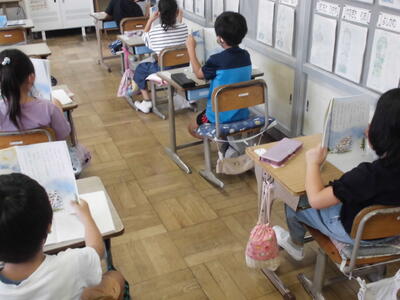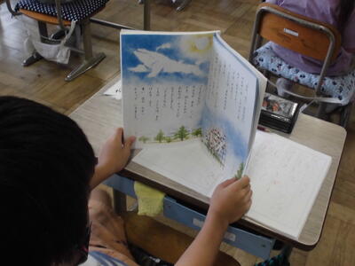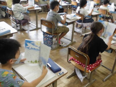 ( ↓ 一年生の国語の授業。くじら雲に乗って子供たちが空を飛ぶというお話を一生懸命に読んでいます。)