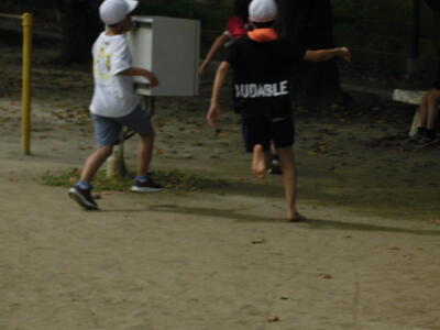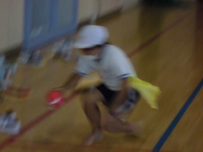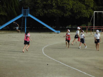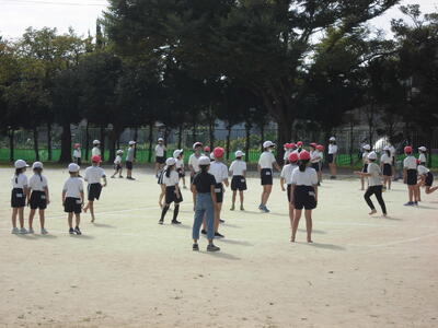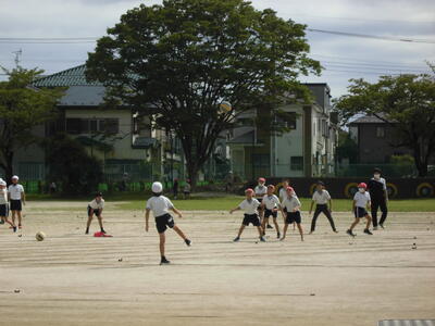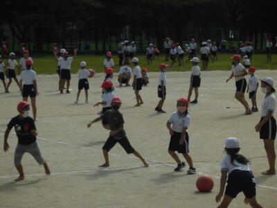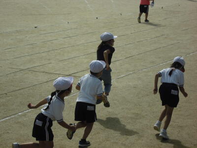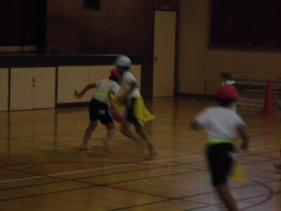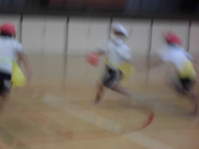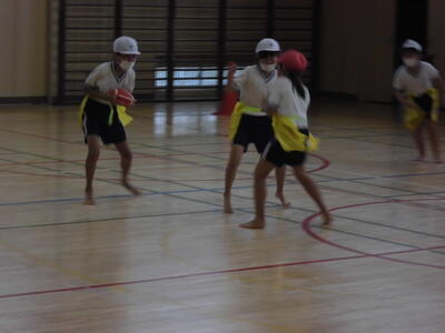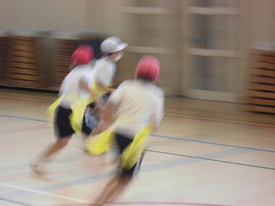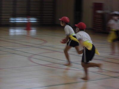 ( ↓ 3年生の体育の授業。タックルをする代わりに相手の腰のフラッグを取って動きを止めるフラッグフットボールに取り組んでいます。)