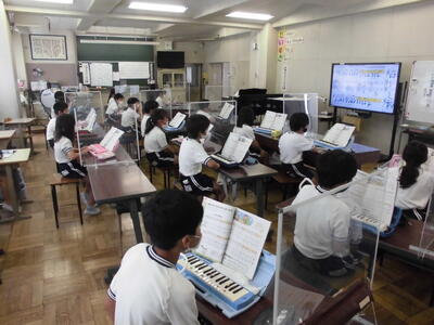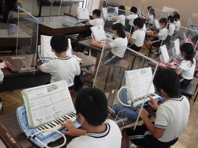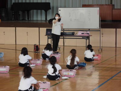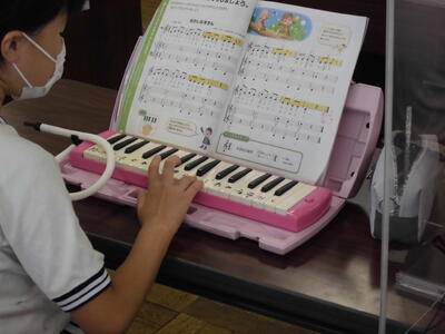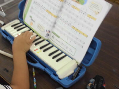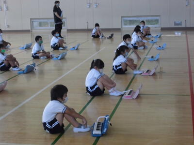 ( ↓ 一年生では、外部から講師の方をお招きして、鍵盤ハーモニカの講習をおこないました。)