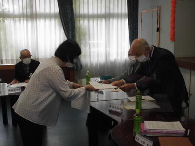 ( ↓ 本日は第2回目の学校運営協議会がありました。教育委員会からの任命書をお渡しして、学校の教育方針などについてご協議をおこないました。)
