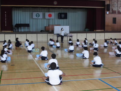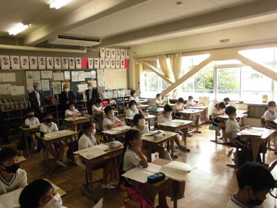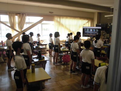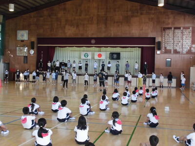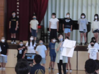 今日の朝は、音楽朝会。体育館で5年生が発表をしました。密を避けるため、体育館では2・3年生が鑑賞し、他の学年はリモートで教室のモニターで発表を鑑賞しました。