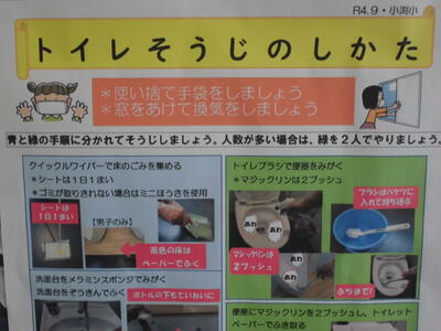 ( ↓ 清掃の仕方が変わったので、清掃担当の先生や保健の先生が、児童向けの解説動画を作成しました。動画では6年生の保健委員も登場しています。)