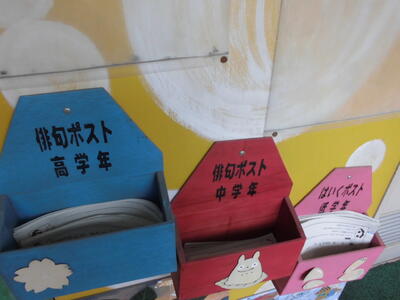 ( ↓ 校長室前の俳句ポスト。子供たちがつくった俳句が投函されています。)