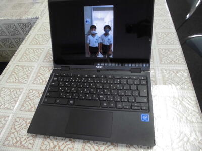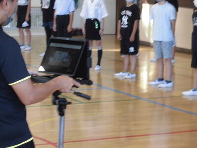 ( ↓ 体育館の様子をリモートで教室のモニターに送っています。)
