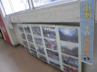 ( ↓ 学校の管理棟一階の廊下の掲示コーナー『小渕っ子の学校生活』。小渕小の一年間の行事や活動が、写真で掲示されています。)