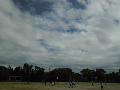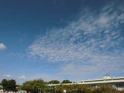 今日の昼休みの様子です。雲の間から晴れ間がのぞいて、子供たちが元気に校庭で遊んでいます。